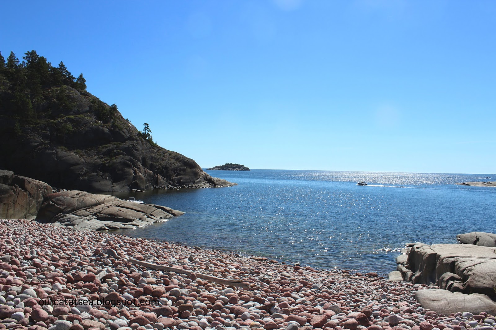 It the awesome nature that impressed us the most: How the mountains of red granite contrast with the countless number of green hues of forest, blue skies and clear deep lovely water. The navigation is easy, where there is water there is the depth. And the lovely mountains are always present, wether undulating in the skyline in all the greens or reds or mysteriously hiding in fog that is revealing and hiding layers of mountains in its unexpected ways. Going up to the mountains, to the imagination awakening troll forests, with lovely scents of Nordic trees and other mountain vegetation, moss covered mighty rocks and cliffs; even there the sea is always with you, its presence makes it easy to breath. The beaches with wave formed round stones going back and fort with water create soothing crackling voice that makes you want to set your camp on the beach, sleeping in that calming noise connecting us to the nature.